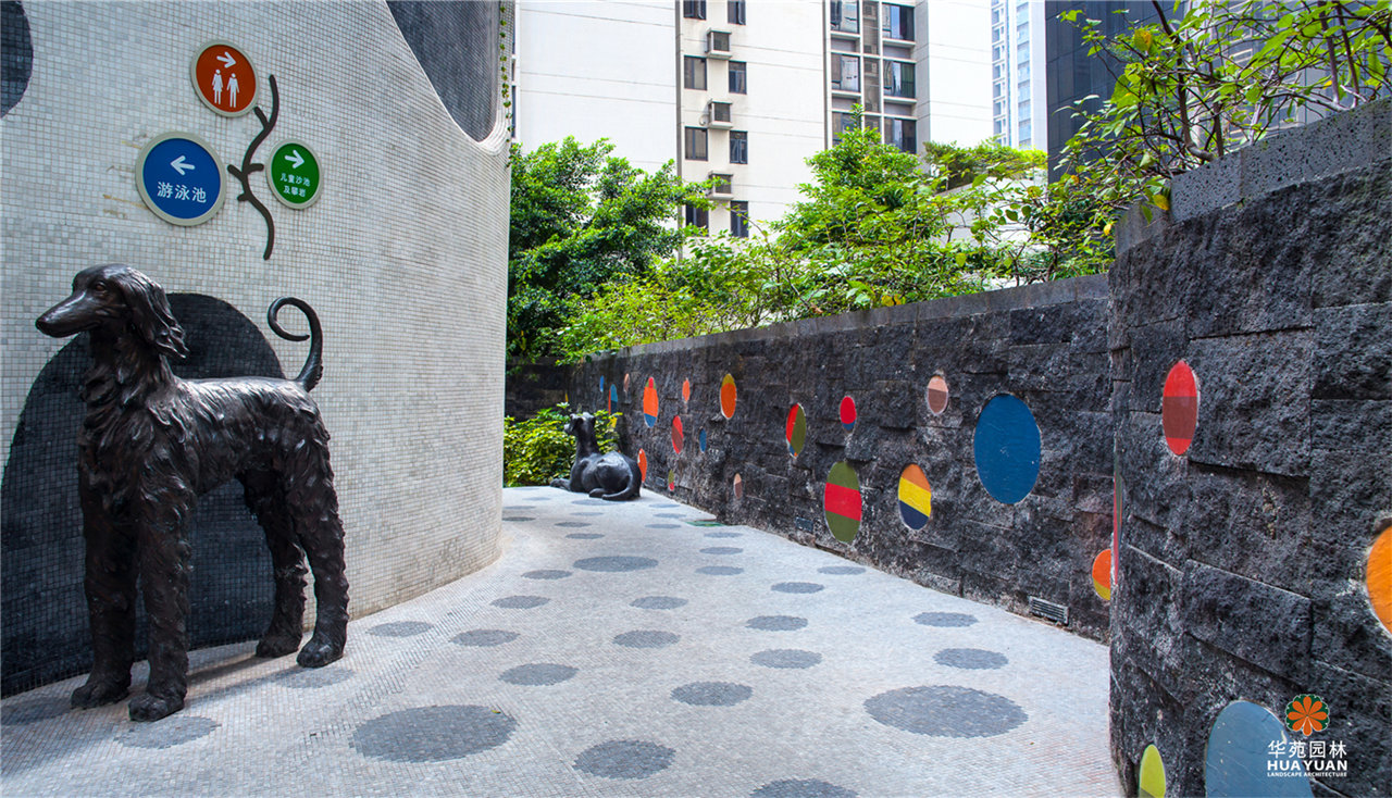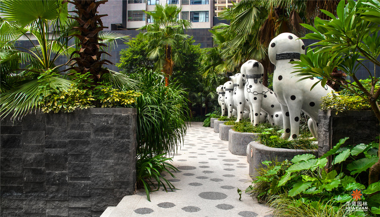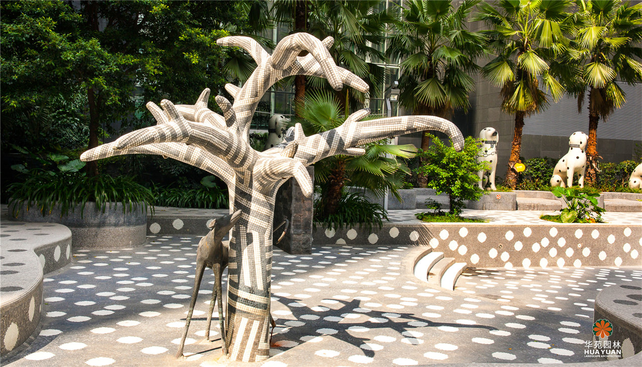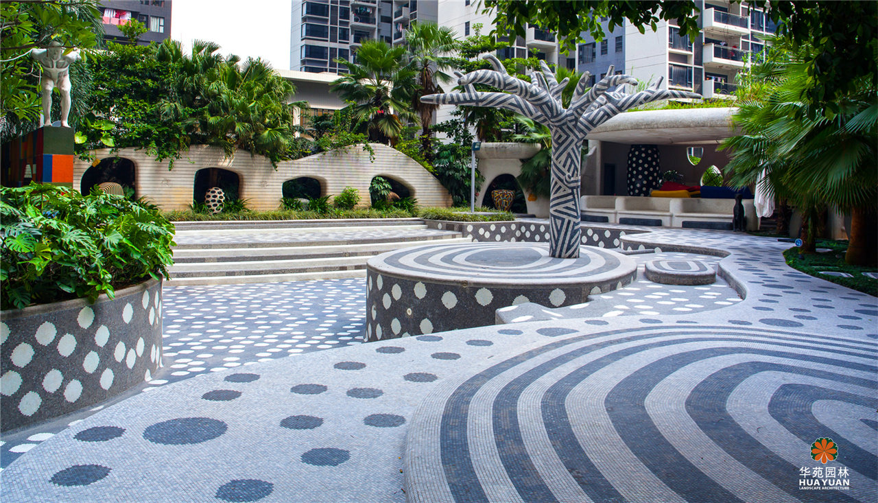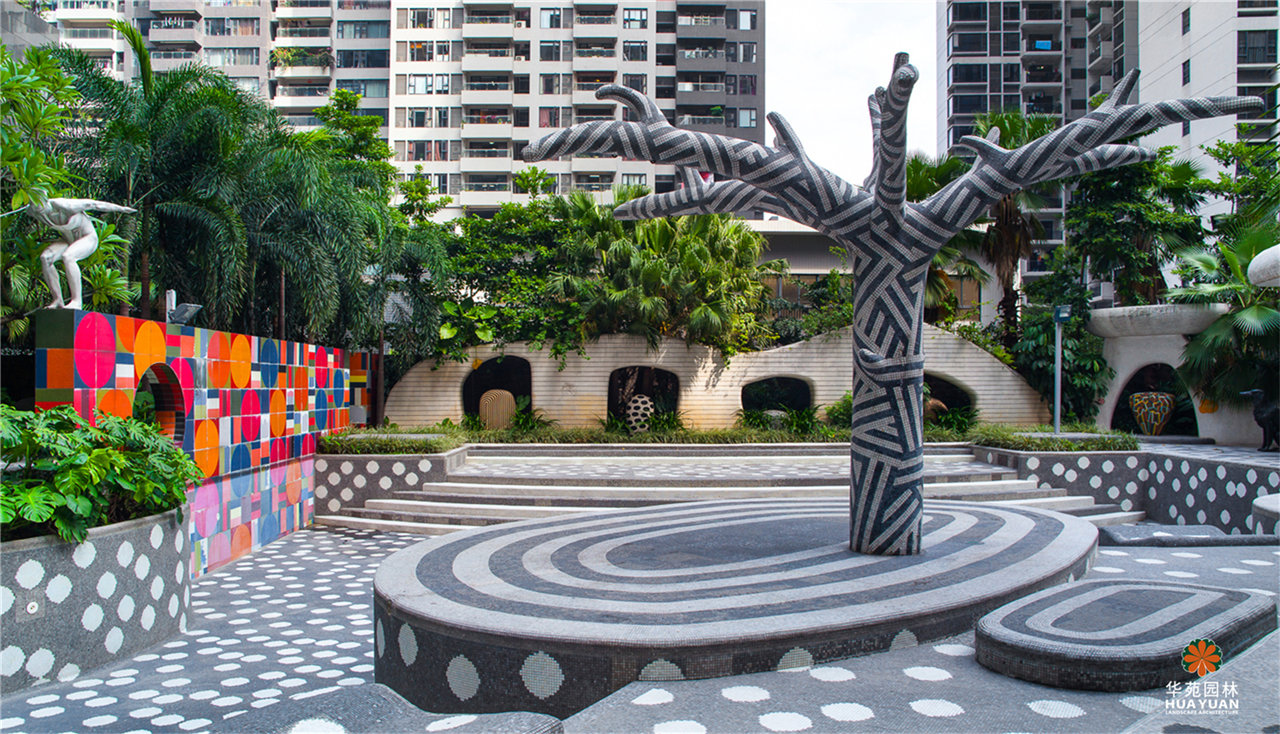 迷幻的馬賽克鋪貼,魔幻的雕塑小品,仿佛進(jìn)入了愛麗絲夢游仙境的場景,充滿幻想與趣味。