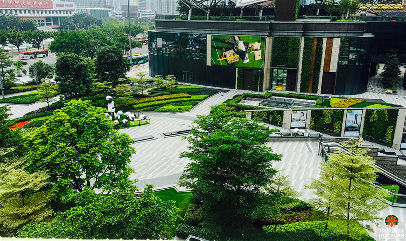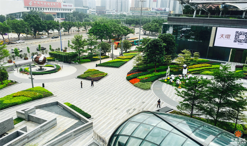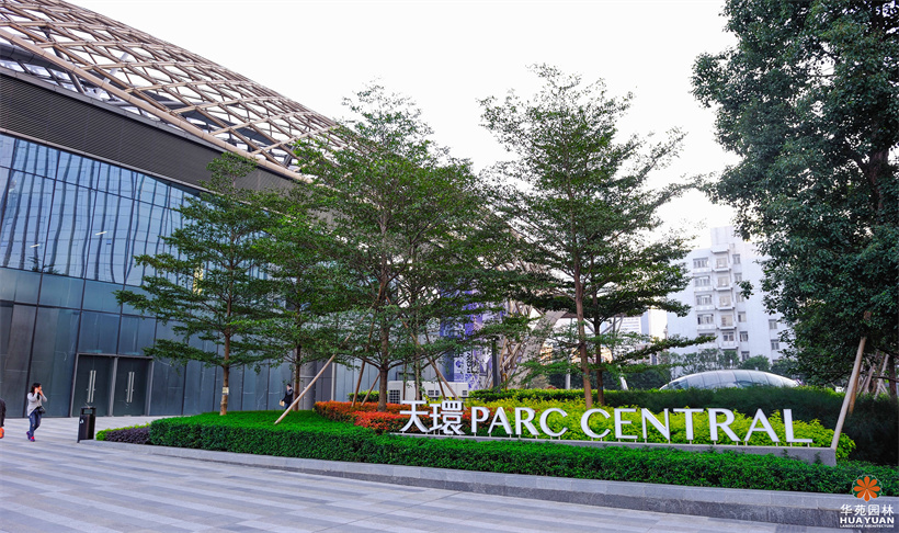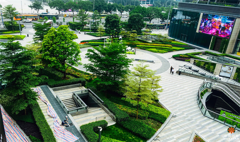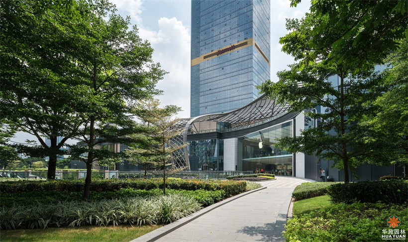 作為廣州的新地標(biāo),天環(huán)廣場(chǎng)的整體園林景觀簡(jiǎn)約、明快,富有季相變化的不同地被修剪成高低各異的塊狀組合,形成色彩絢麗的下層綠化帶,以姿態(tài)優(yōu)美的喬木作點(diǎn)綴,與灰、白為主的冷調(diào)鋪裝,構(gòu)建出具有現(xiàn)代格調(diào)的園林空間。