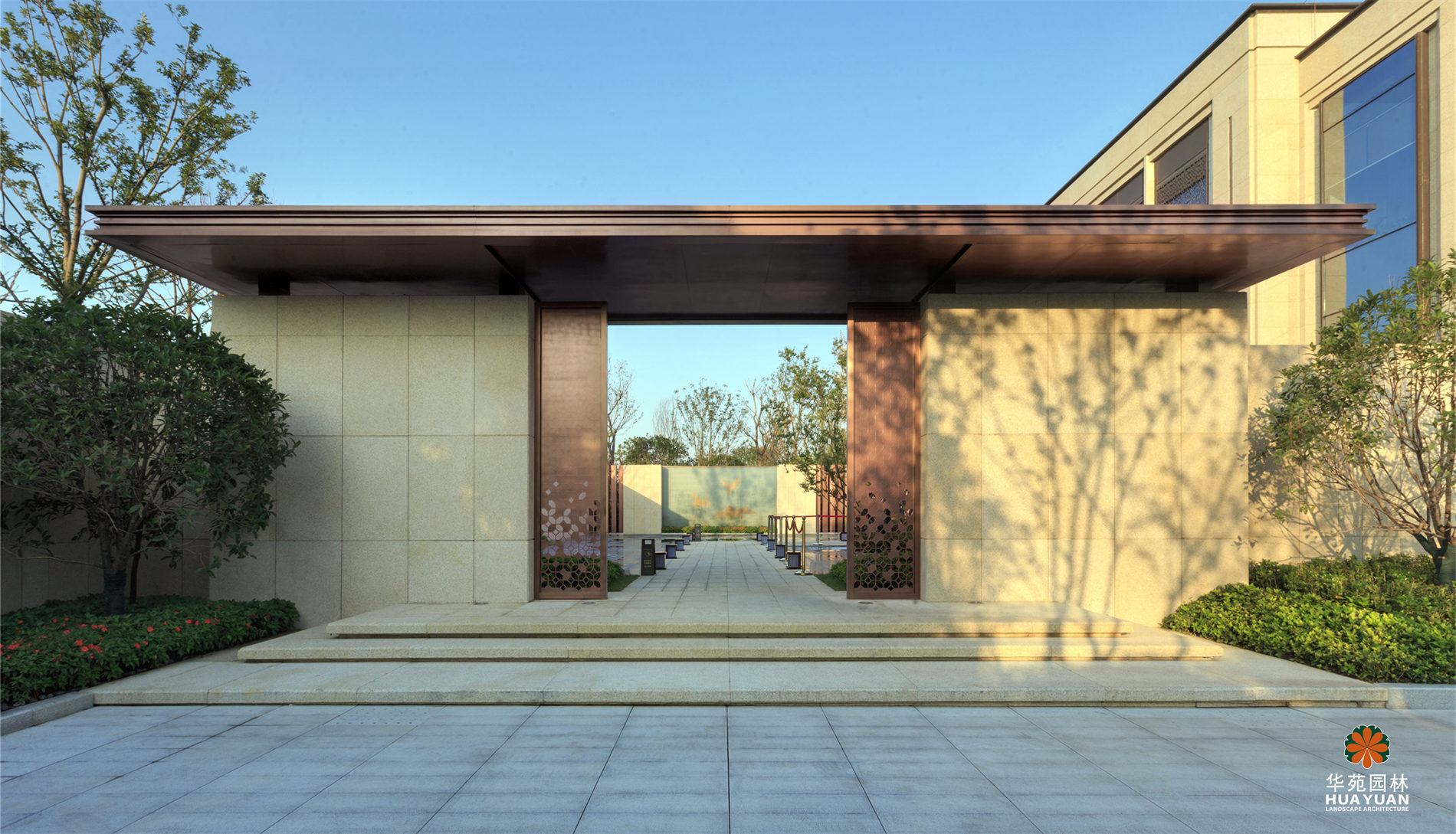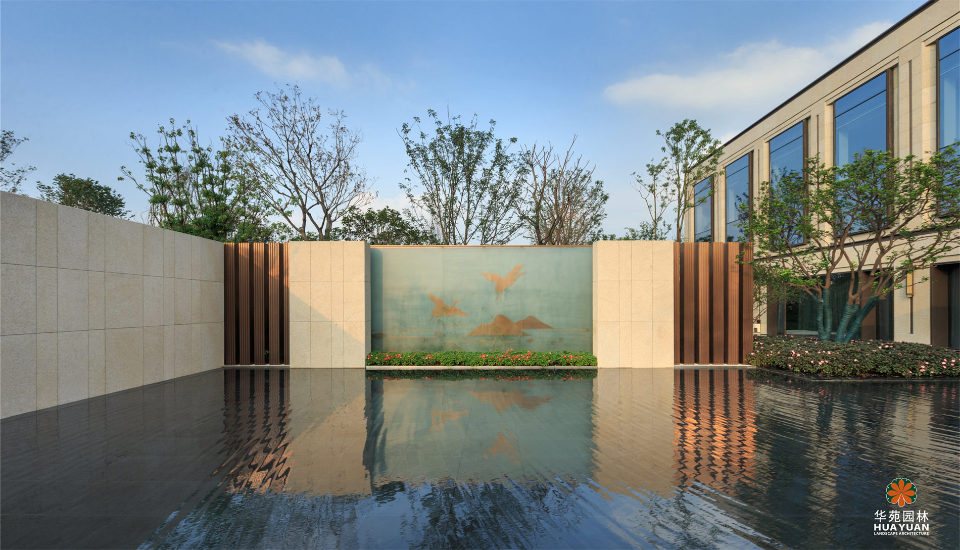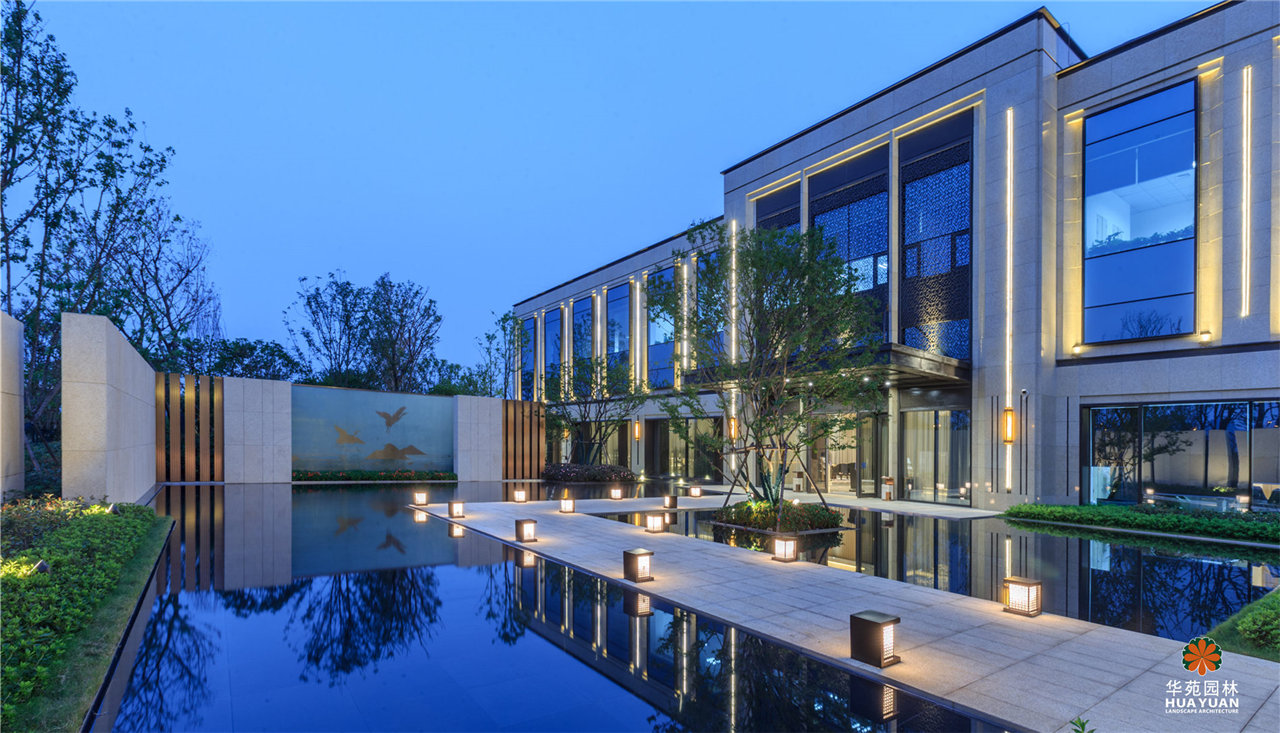 融創(chuàng)布局東西湖的首個高端精品系項目。左右兩側(cè)開敞的大幅鏡面水景,汀道自水面穿過,孤植樹、燈光、墻影倒映水中,幻化出一方鏡像空間;簡約的Logo景墻、融合傳統(tǒng)中式紋路的門樓、“山形鶴影”的主題屏風(fēng),皆以現(xiàn)代語言構(gòu)建出中式園林之神髓。