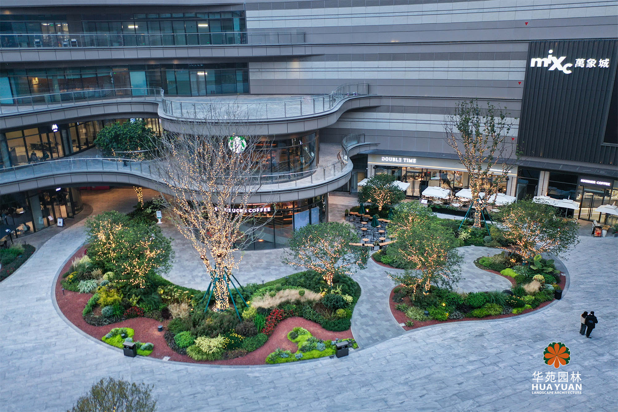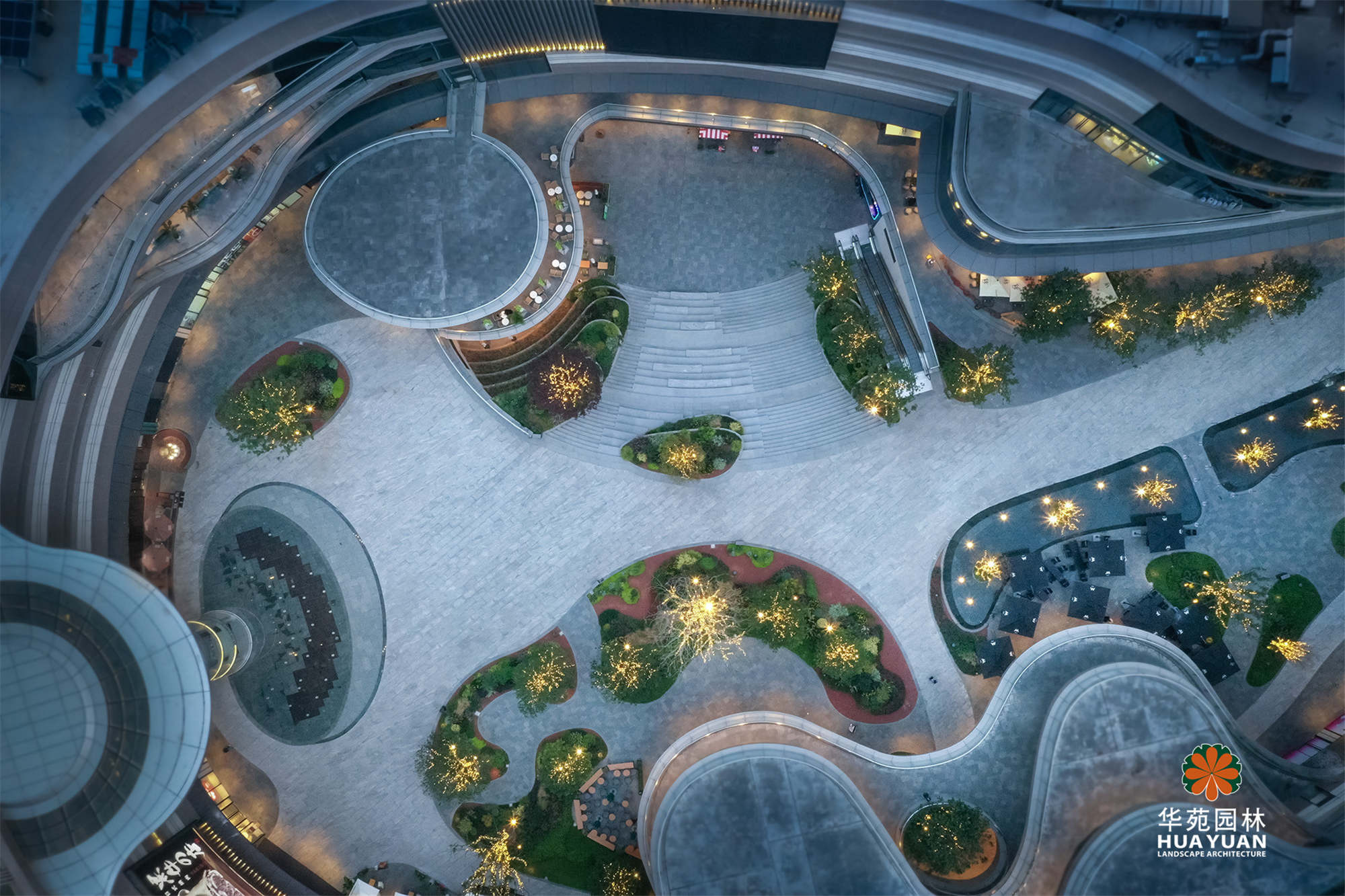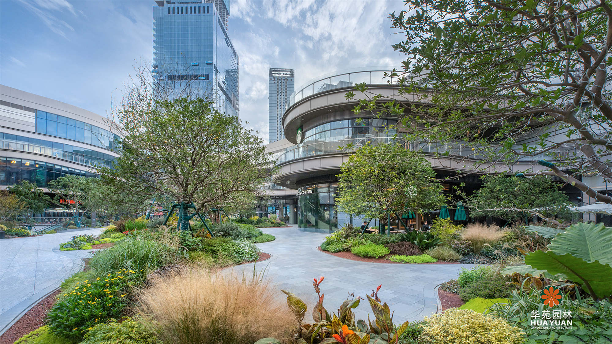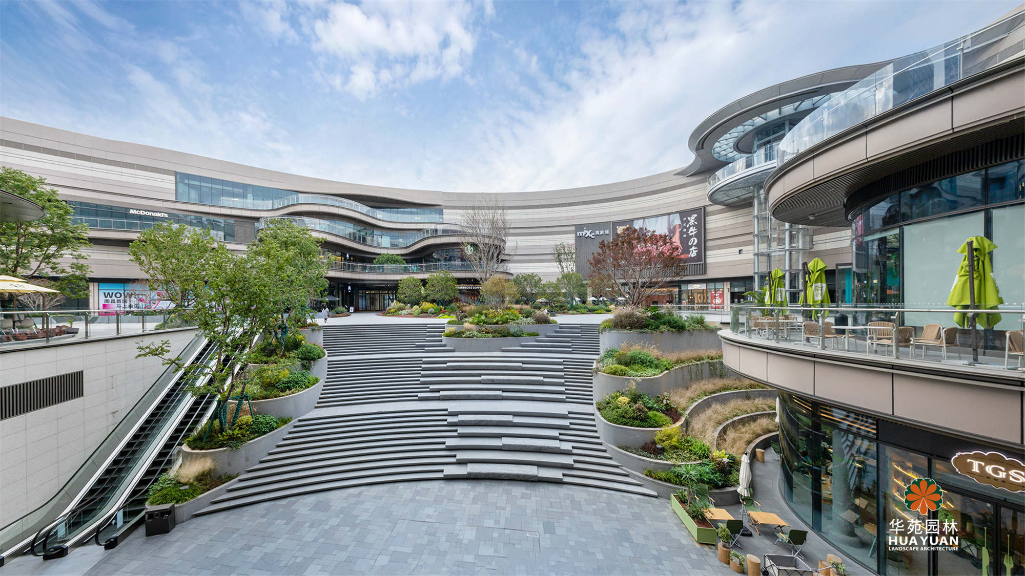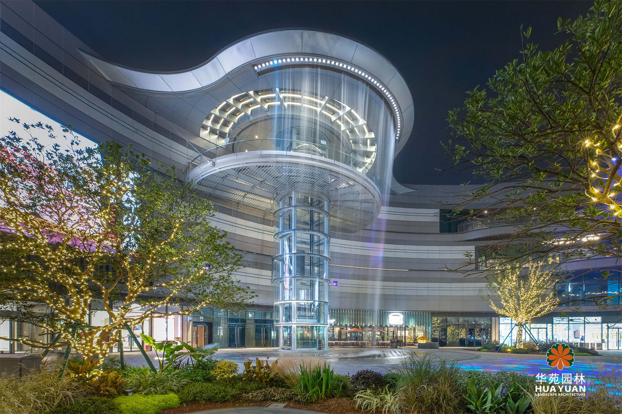 項(xiàng)目景觀汲取當(dāng)?shù)氐淖匀蝗宋奶厣?,采用不同的造景方式,將氣?shì)宏大的瀑布、形式多樣的水景、多重弧線的下沉廣場(chǎng)與豐富多姿的花境融合,營造現(xiàn)代簡(jiǎn)約、舒適自然的高端商業(yè)景觀空間。