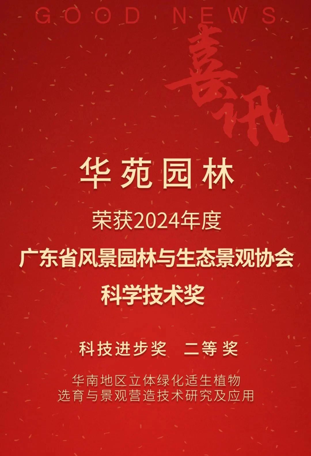 近日,廣東省風景園林與生態(tài)景觀協(xié)會公布了2024年度科學技術獎的獲獎名單。其中,華苑園林所申報的“華南地區(qū)立體綠化適生植物選育與景觀營造技術研究及應用”項目榮獲科技進步獎二等獎。